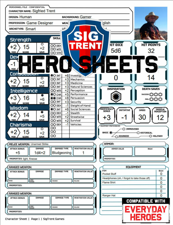 All the money raised by these Character Sheets goes towards funding the creation of new projects and supplements for Everyday Heroes at SigTrent Games!