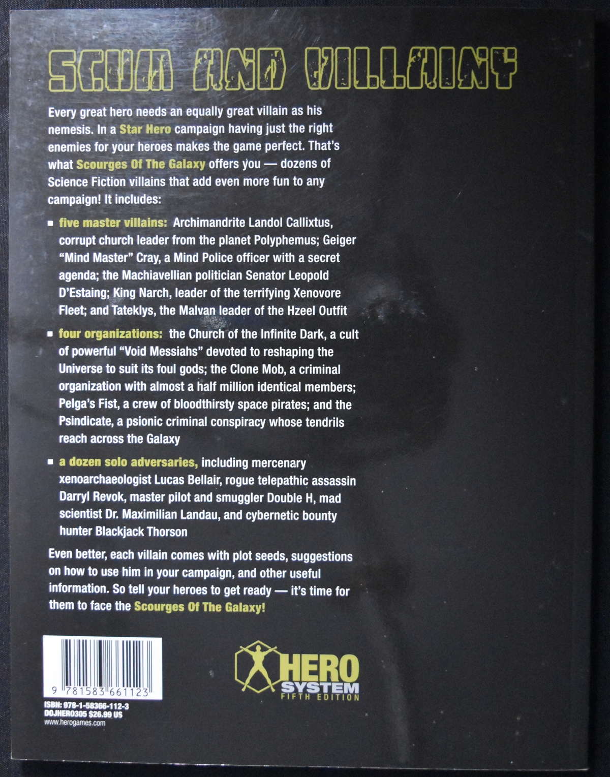 Scourges Of The Galaxy is a short volume of enemies and adversaries for a Star Hero campaign. The default setting assumed is the Hero Terran Empire Setting, this is done simply to give character backgrounds some context to work from. Changing out specifics is pretty easy, and transplanting the characters themselves to another setting is also easy. The book contains about forty characters in it.