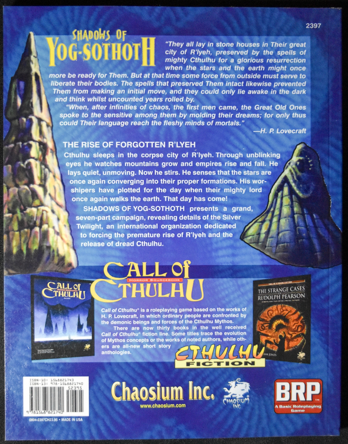 Shadows of Yog-Sothoth is a modestly-sized campaign of seven scenarios. During the course of play the investigators penetrate the outer layers of a secret sinister occult organization led by the lords of the Silver Twilight. Beginning in Boston they investigate an organization in New York, run afoul of a coven in Scotland, roam the desert of the American southwest, vacation off the coast of Maine, and explore the mysteries of the South Pacific.