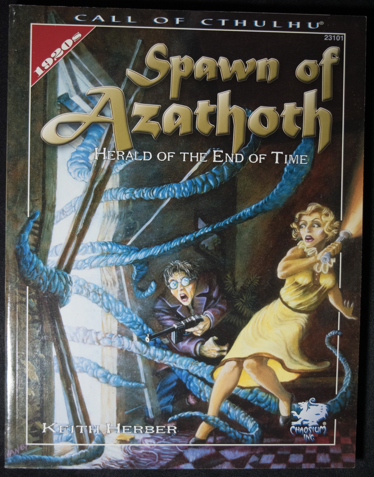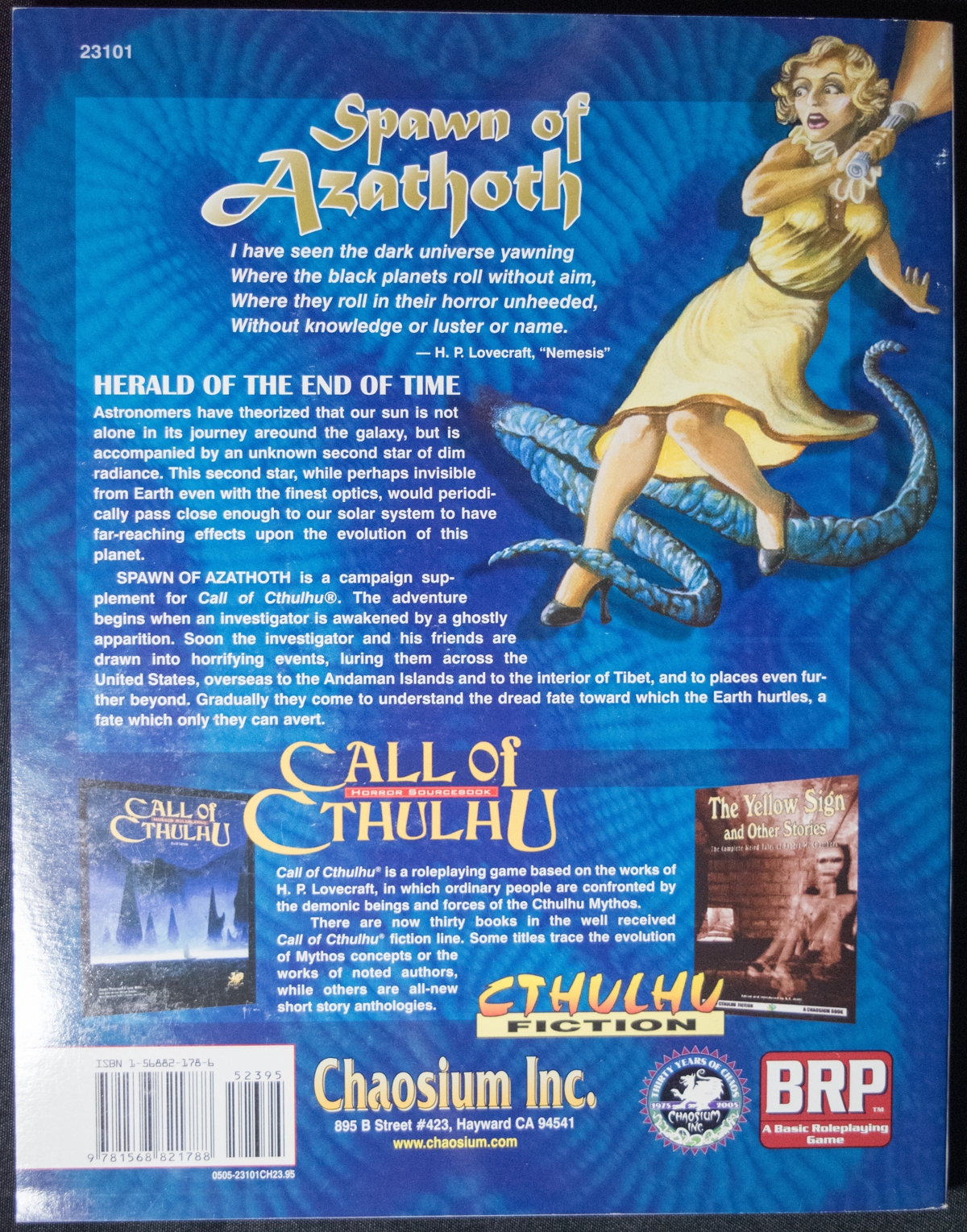 SPAWN OF AZATHOTH is a campaign supplement for Call of Cthulhu. The adventure begins when an investigator is awakened by a ghostly apparition. Soon the investigator and his friends are drawn into horrifying events, luring them accross the United States, overseas to the Andaman Islands and to the interior of Tibet, and to places even further beyond. Gradually they come to understand the dread fate toward which the Earth hurtles, a fate which only they can avert.